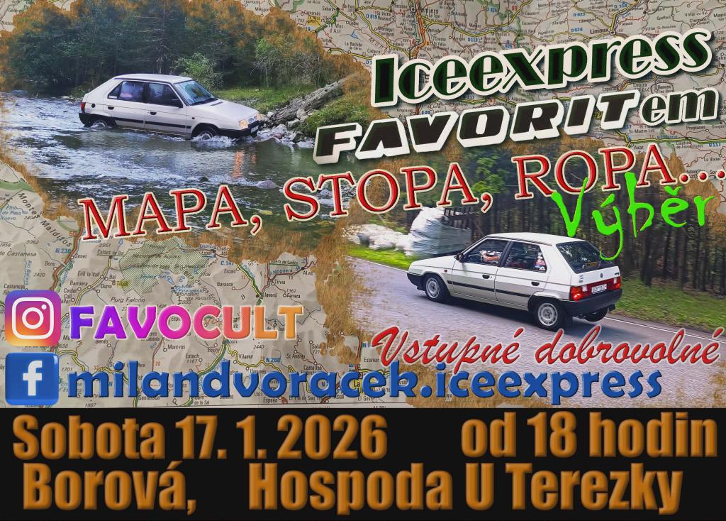 Cestovatelská přednáška "Mapa, ropa, stopa", jistě zaujme jak milovníky značky Škoda, ale i ty, kteří mají rádi hory, moře, dopravní stavby, historii a tajemno.  Na dnes již kultovním voze Škoda Favorit jsme odjezdili tři sezóny po nejimpozantnějších cestách Alp. Od pramene Rhôny dojeli do její delty, a pokračovali až do Pyrenejí. Na tachometru přibylo bezmála 30 000 km "nalítaných" po 8 státech. To vše jsme se pokusili vmáčknout do dvou hodin vyprávění.